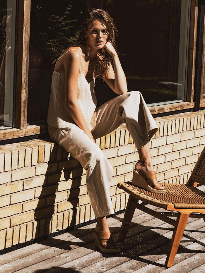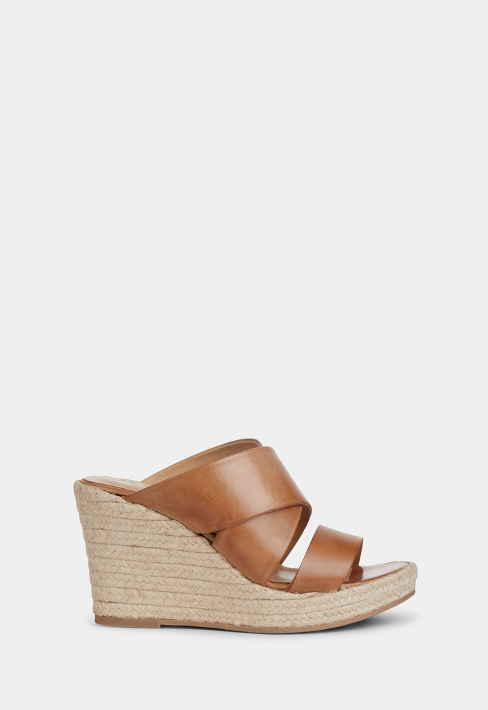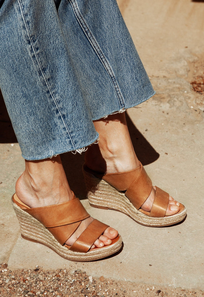 Meet our signature interpretation of the classic summer sandal – the iconic espadrille wedge. The Bella Sandal is handcrafted from escuvado leather with comfortable, wide crossover straps.