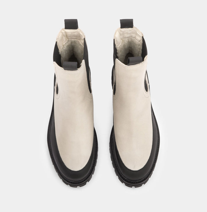 Iowa is a combat inspired slip-on boot in vegetal leather with a soft wool lining, an exaggerated rubber sole and straps front and back.