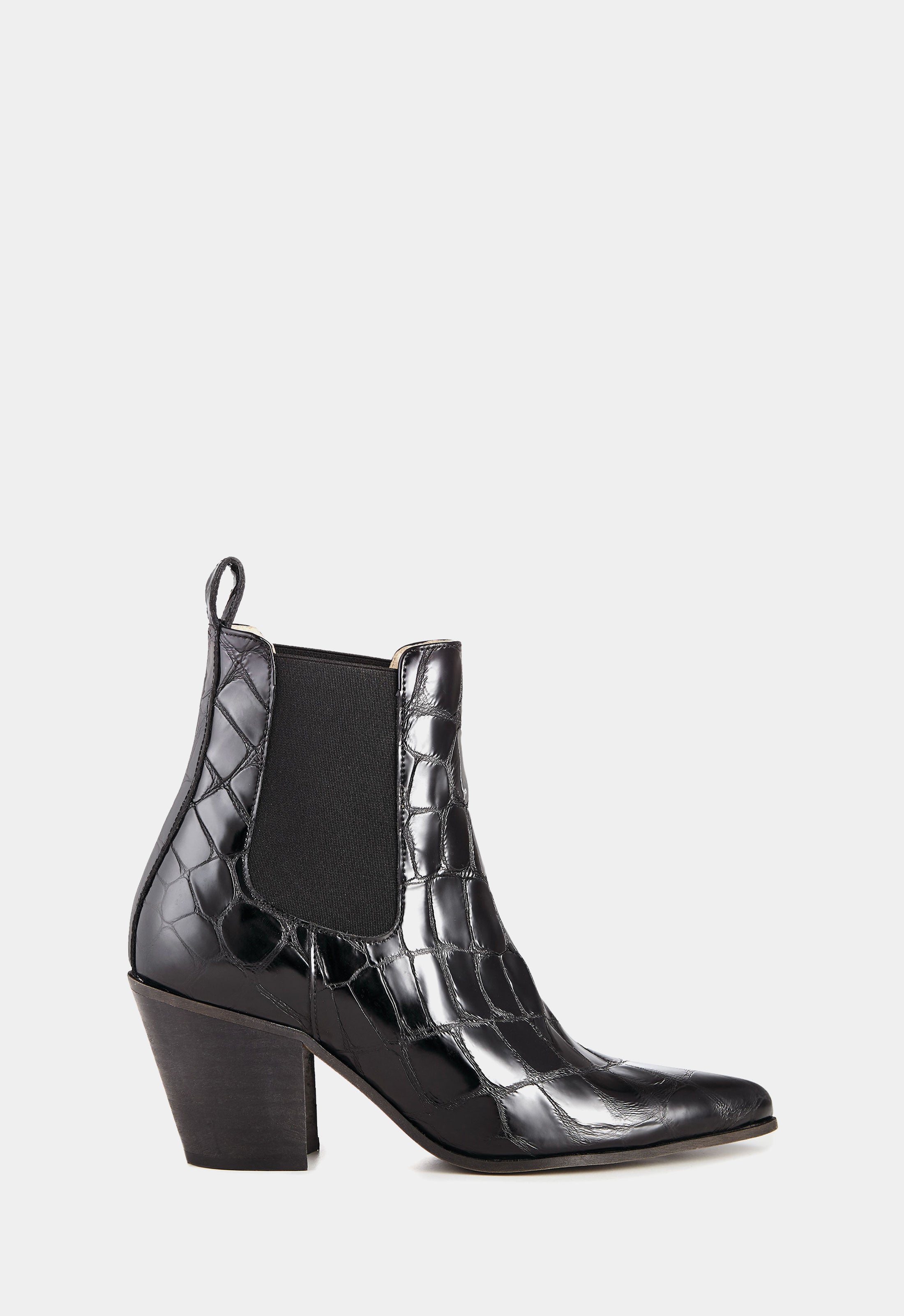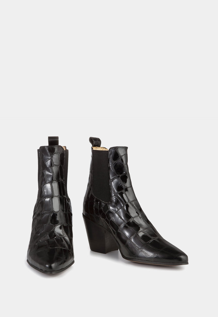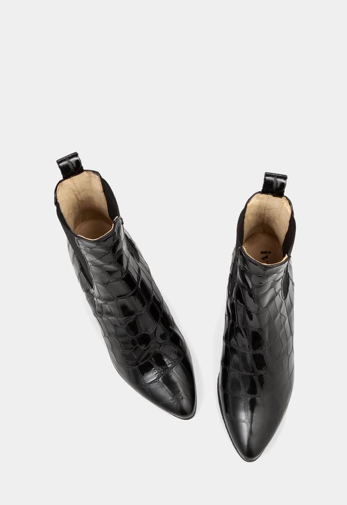 The Pamela Boot brings a sleek, sculptural twist to the classic Chelsea silhouette. Crafted in glossy faux-croco leather, it delivers a bold, textural statement while maintaining Ivylee’s signature balance of clean lines and feminine edge. The pointed toe and angled block heel create an elegant, elongated shape that elevates both everyday and evening looks.