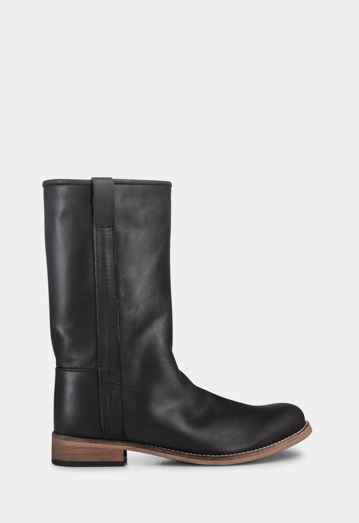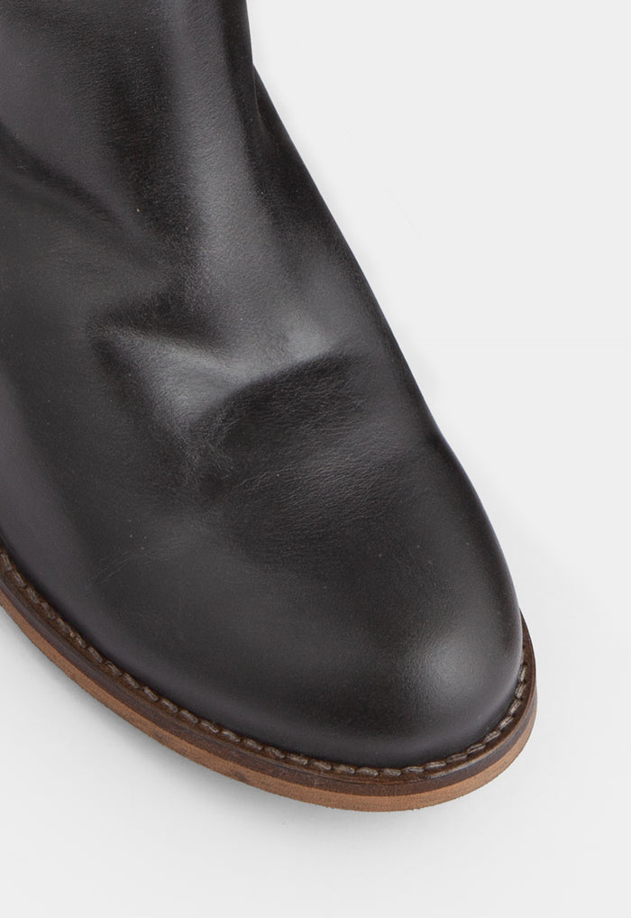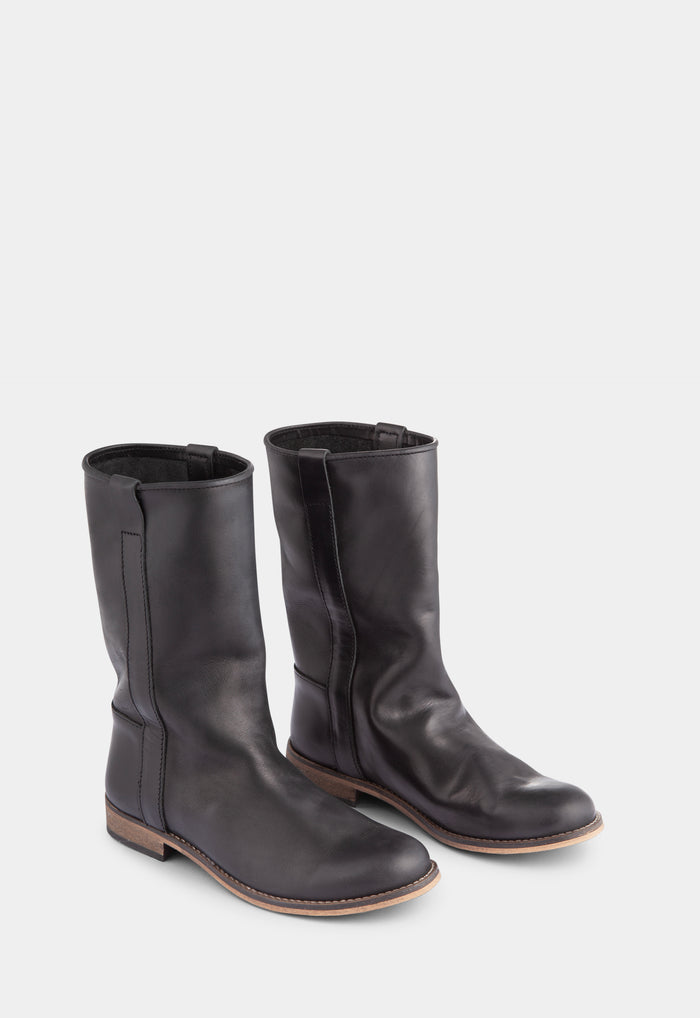 The Simone Boot is a flat, medium high boot made from one piece of leather with a straight shaft, side pull loops and a rounded toe. The absence of lining gives the boot an extra soft feel with wear.