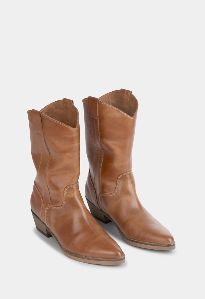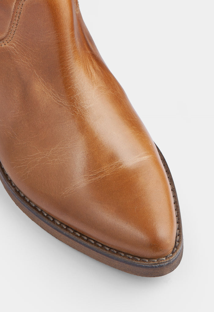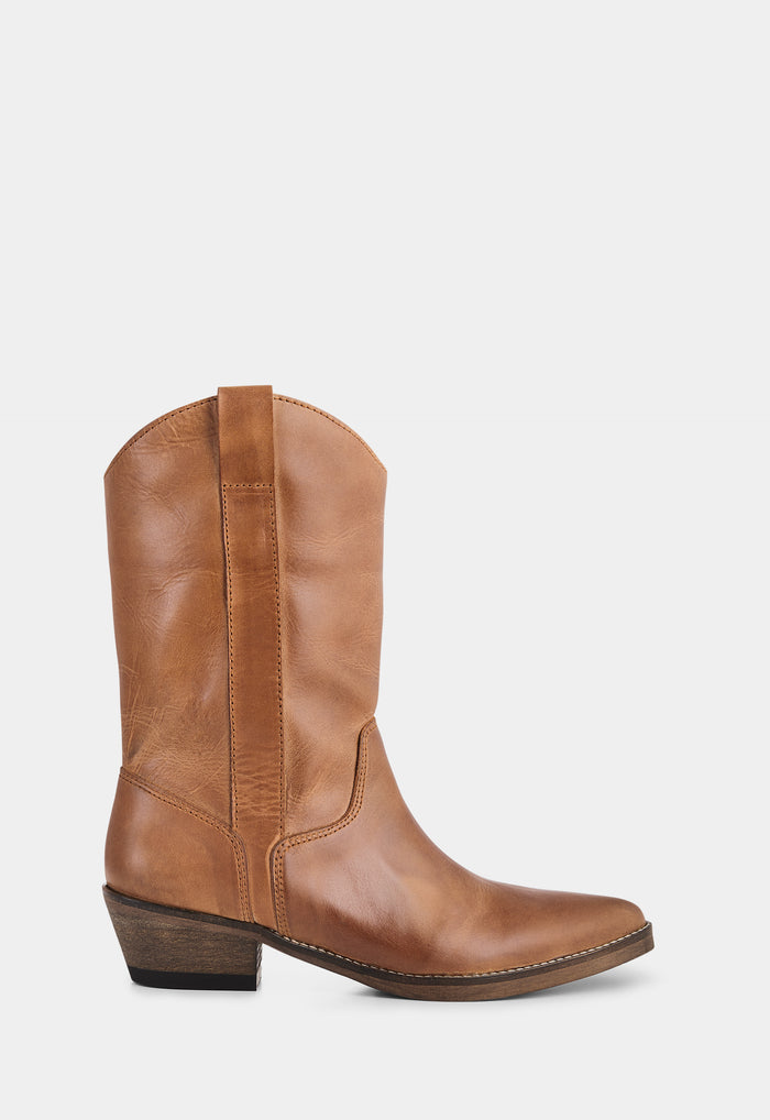 The Tracy Boot has a distinct Western vibe. With a slightly angled and stacked heel and pointy toe, the boot has pull straps and scuffs will just add to the boot’s unique patina.